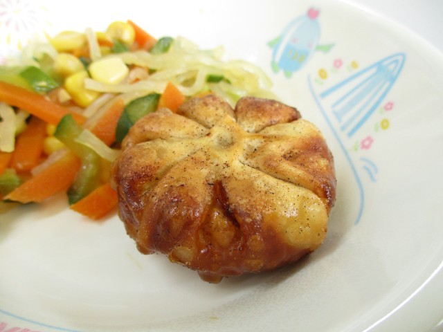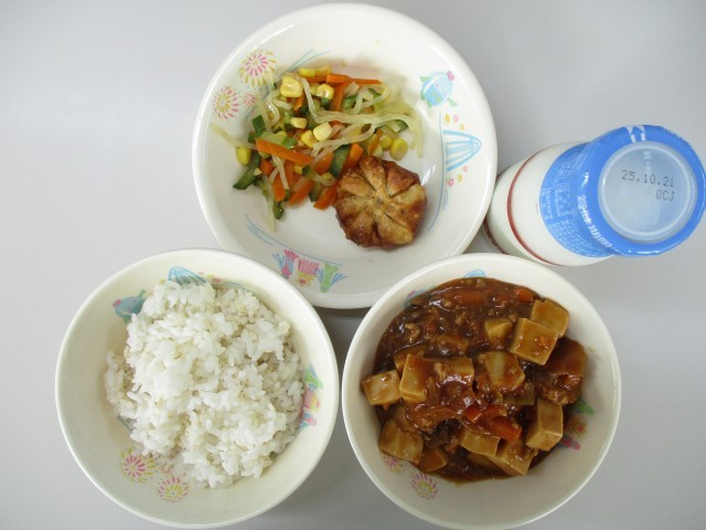 今日の給食は、麦ごはん、牛乳、マーボー豆腐、にらまんじゅう、はるさめサラダです。