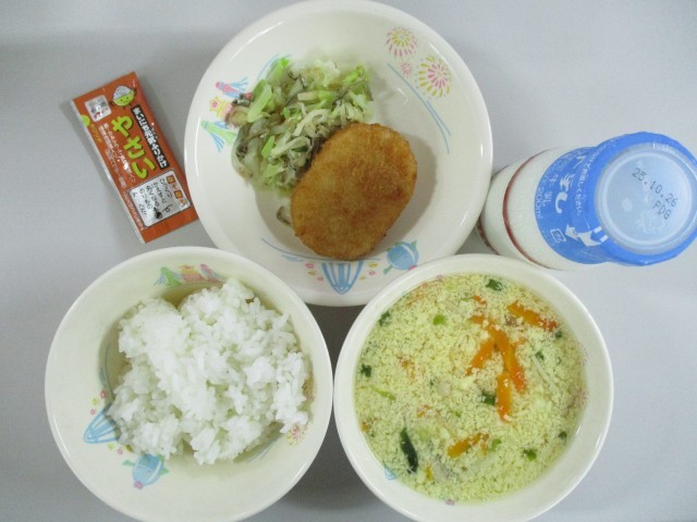 今日の給食は、ごはん、牛乳、栗コロッケ、じゃこキャベツ、かきたま汁、野菜ふりかけです。