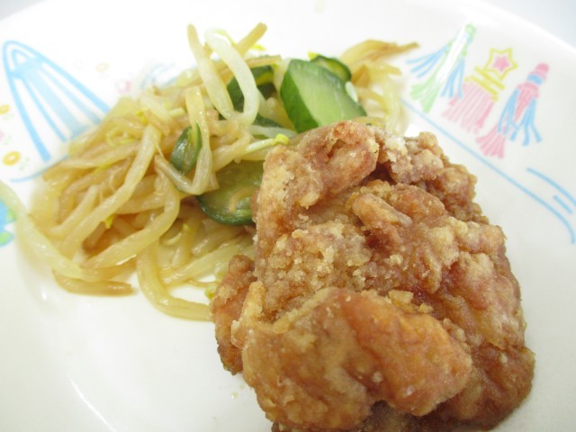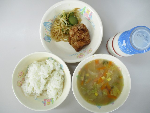 今日の給食は、ごはん、牛乳、ユーリンチー、もやしの中華和え、中華コーンスープです。