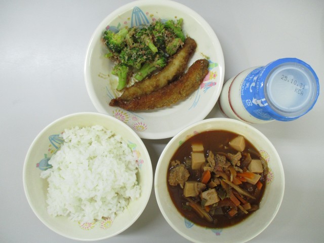 今日の給食は、ご飯、牛乳、ししゃもフライのごまだれがけ、ブロッコリーのおかか和え、ぶた汁です。