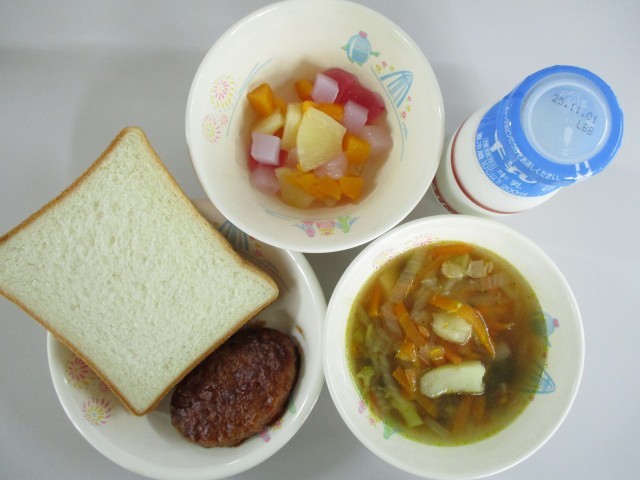 今日の給食は、スライスパン、牛乳、ハンバーグのケチャップソースがけ、ぶどうセリー和え、コンソメスープです。