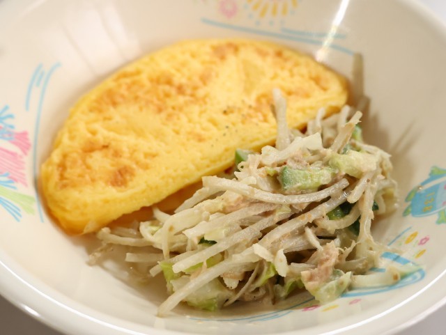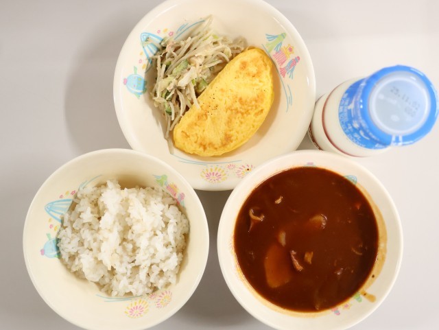 今日の給食は、麦ご飯、牛乳、お豆のブラウンシチュー、オムレツ、ごぼうサラダです。
