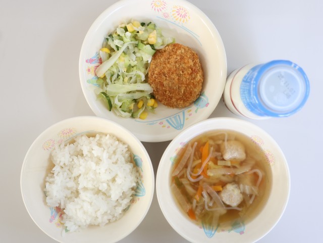 今日の給食は、ご飯、牛乳、メンチカツ、塩だれサラダ、とり団子汁です。