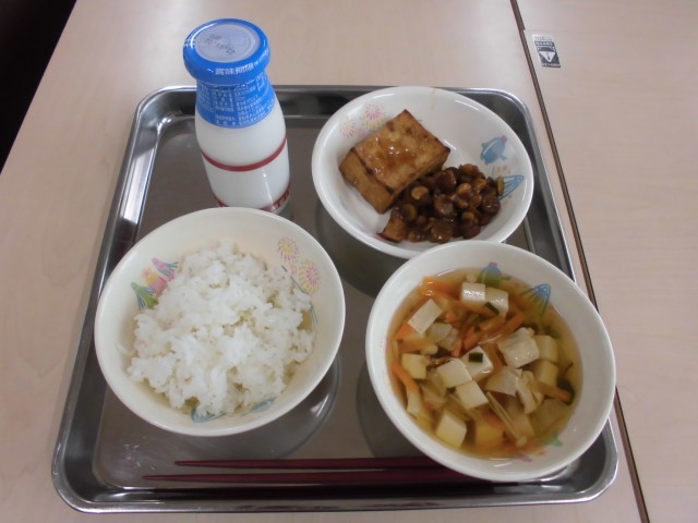 今日の給食は、ご飯、牛乳、絹厚揚げのそぼろあんかけ、鉄火みそ、湯葉のすまし汁です。