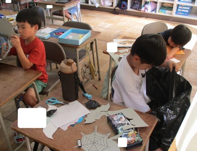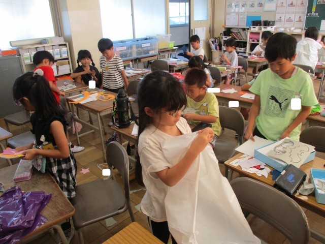 きらわく運動会の衣装を考えて作ろうというめあてで活動しました。好きな色のビニール袋に3か所の穴をあけ、自分の好きな装飾をしていきました。
