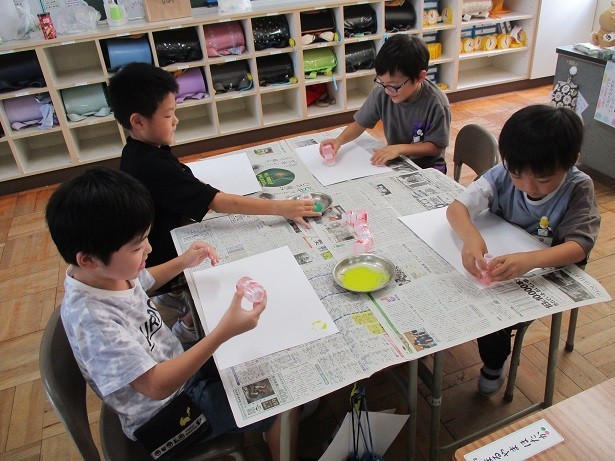 スタンプをして作品を作ろうというめあてで活動しました。大きさの違う容器に絵の具をつけてスタンプをしていきました。