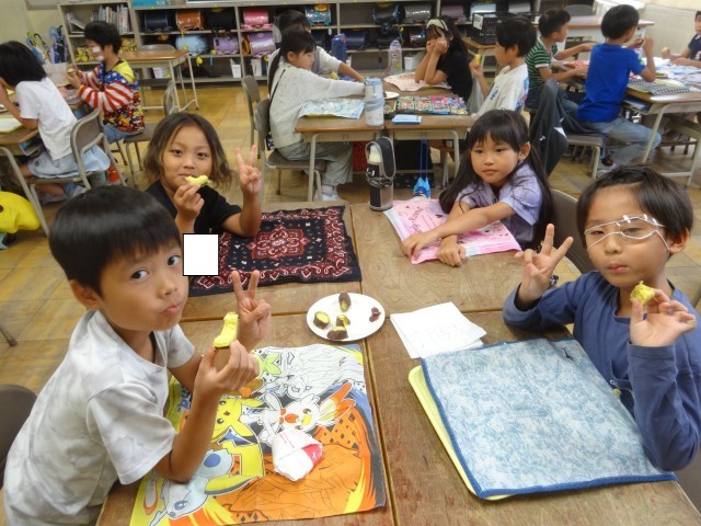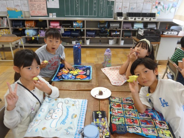 炊飯器でいもをふかして給食の前に仲良く食べました。