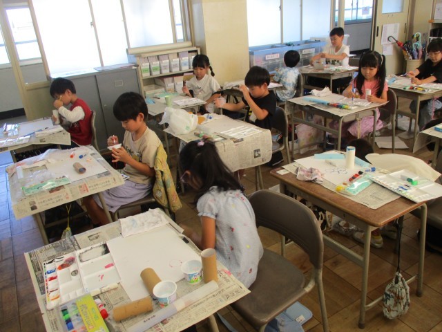 いろいろなものでスタンプをしました。トイレットペーパーの芯や洗濯ばさみに、絵の具で色を付けてペタペタスタンプです。