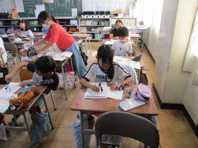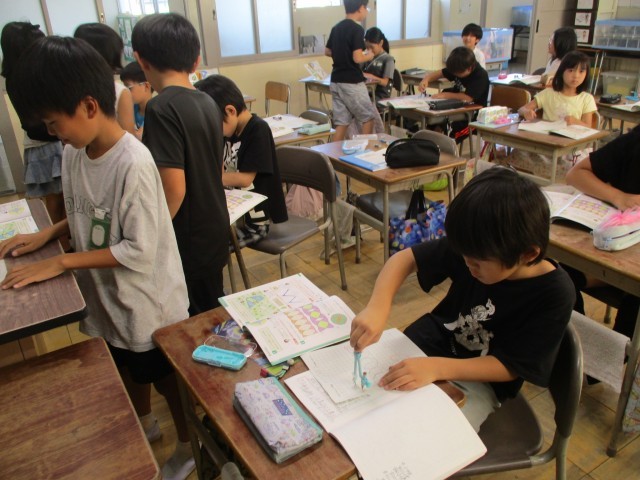 コンパスを使った作品作りを行いました。円をうまく書こうと、体の向きまで傾けながら一生懸命取り組んでいます。