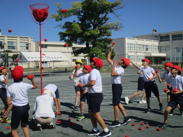 運動会に向けて、競争遊戯の練習をしました。5,6年生は玉入れです。ふわっと球を放物線上に投げて、かごに上手に入れています。