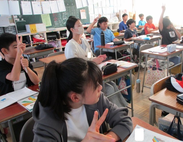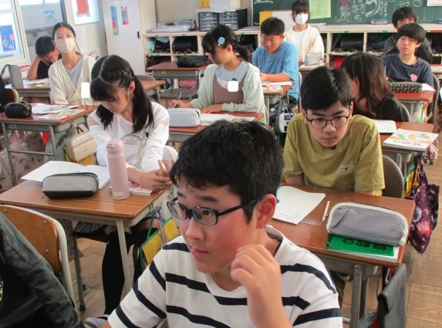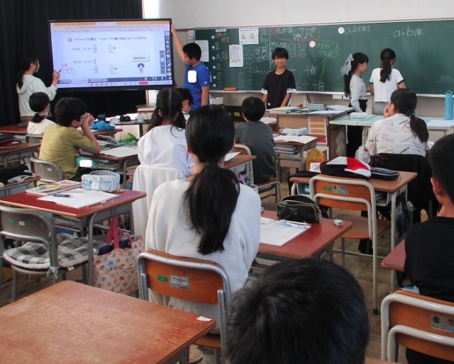 比が等しいかどうか調べようというめあてで学習しました。比の値が等しくなるものは比が等しいと児童が説明しました。
