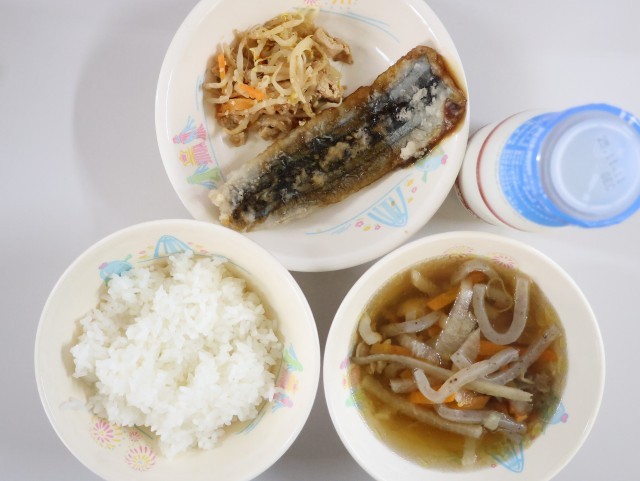 今日の給食は、ご飯、牛乳、さんまのかば焼き風、もやしのごま酢和え、沢煮わんです。