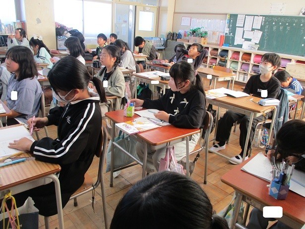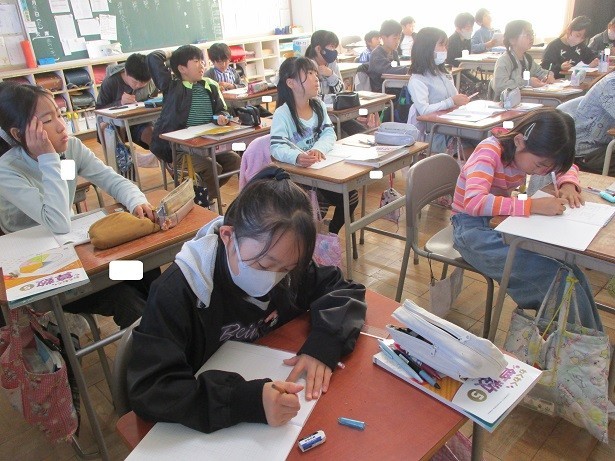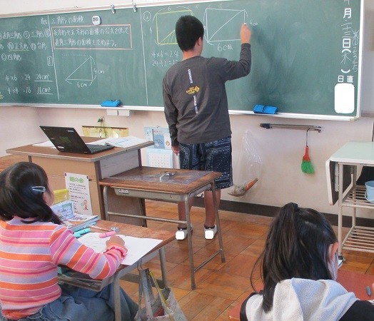 長方形や正方形の面積の公式を使って直角三角形の面性を求めようというめあてで学習しました。直角三角形を高さ半分のところで切り、切り取った三角形を下の台形にはめると高さ半分の長方形になるということを使って面積を求められると説明できる児童もいました。