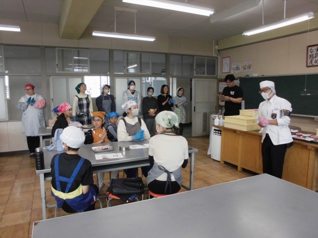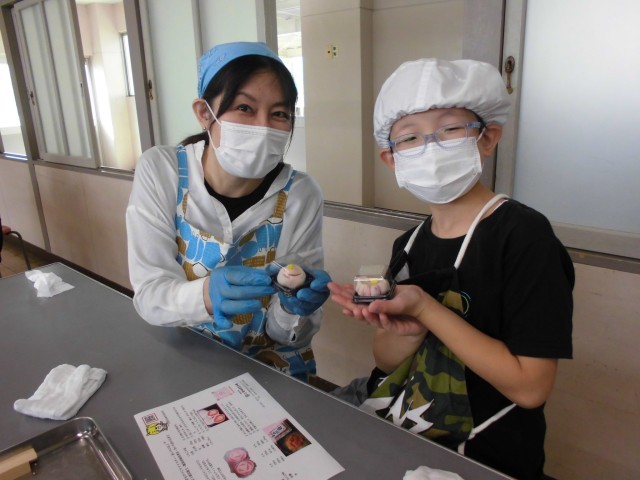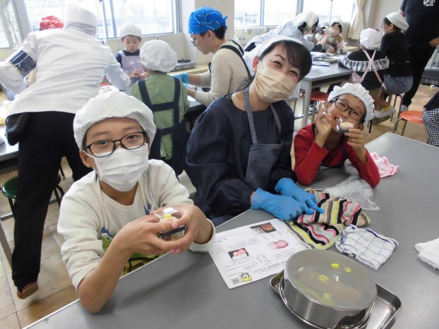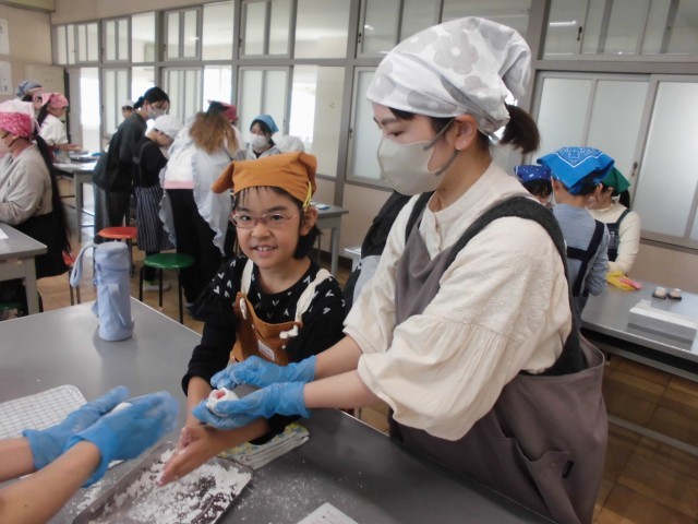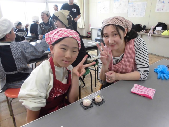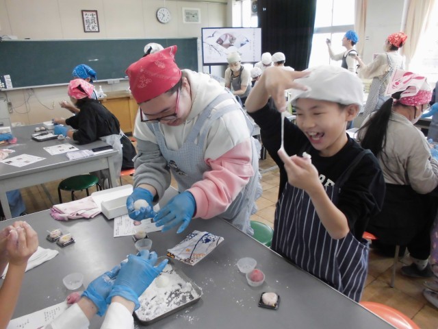 菓子本舗野田屋さんにお越しいただき、PTAふれあい文化教室を行いました。「ものづくりマイスター」の資格を持つ野田屋さんが丁寧に教えてくださいました。バラ、さくらをモチーフにしたお饅頭と、いちご大福、わらび餅をつくりました。