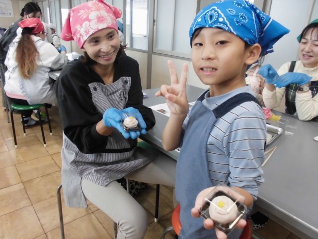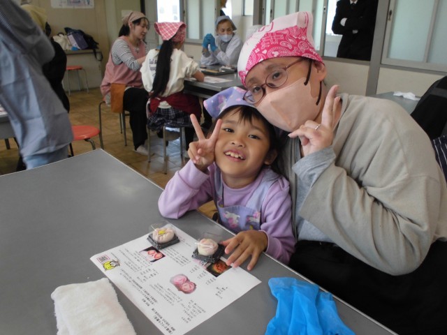 ・作るのが楽しかった。・あんこを包むのが難しかった。また作りたいです。・初めて和菓子作りをして、子供が楽しそうにしてて、参加してよかったです。・少し、子供にはむずかしいと思っていましたが、しんけんにやっている姿を見て良かったです。・和菓子作りはなかなか経験できないので、大人も子供も楽しめました。・いい経験になった。・触った感じが気持ちよくて楽しかった。・お店の方の技術がすごいなあと思った。・ねりきりは桜の花を作りました。花びらを作るとことがおもしろかったです。いちご大福は大変でした。