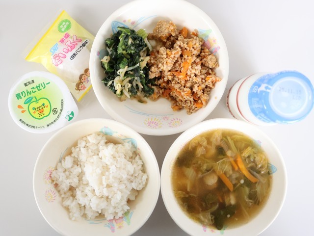 今日の給食は、麦ご飯、牛乳、ビビンバの具、ビビンバの野菜、キムチスープ、セレクトデザート(青りんごゼリーか豆乳だいふく)です。