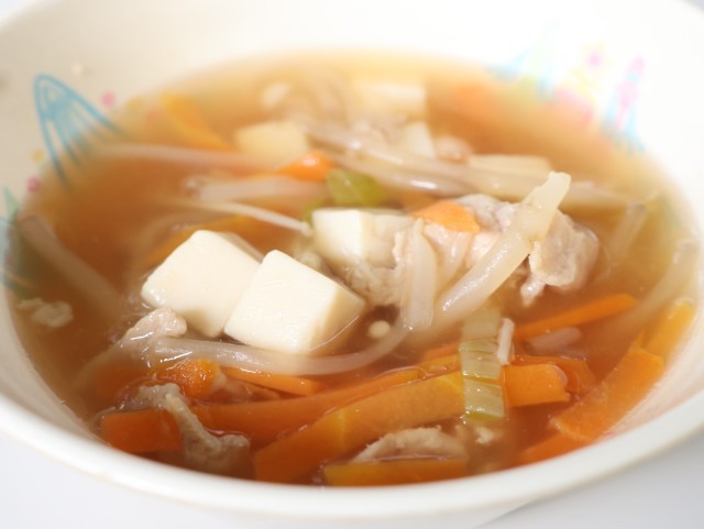 小学3年生で学習する「すがたをかえる大豆」にちなみ、みそ、豆乳、高野豆腐など姿を変えた大豆製品を使った料理が、6日から12日まで登場しています。今日の「豆腐の中華スープ」には、大豆製品である豆腐を料理に使っています。