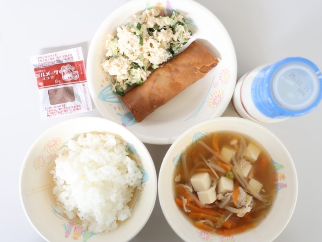 今日の給食は、ご飯、牛乳、春巻、バンバンジー、豆腐の中華スープ、ココアパウダーです。