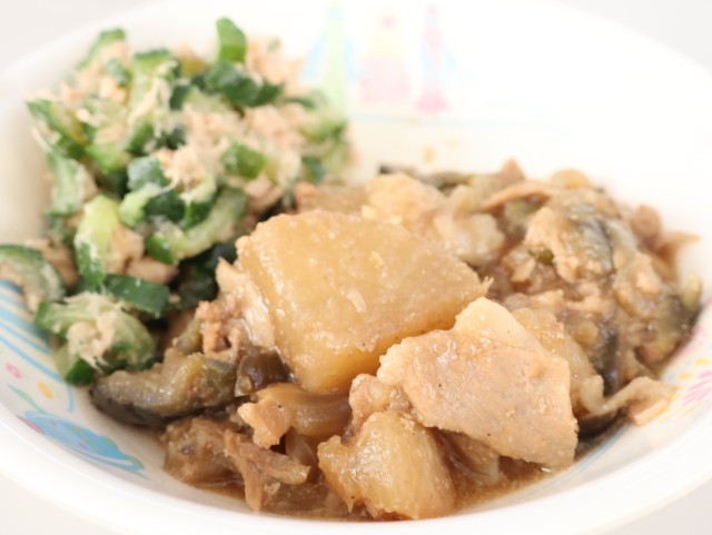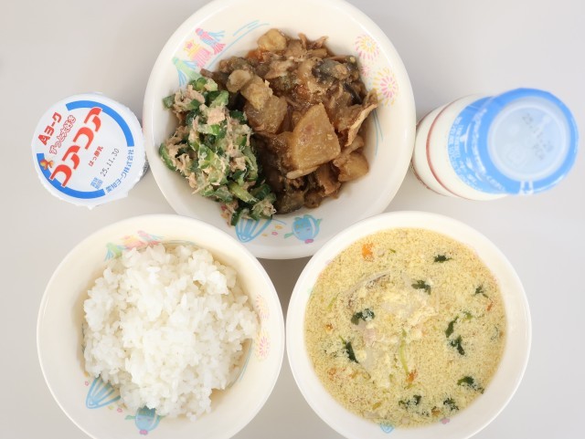 今日の給食は、ご飯、牛乳、梅味ぶたごまだいこん、きゅうりのツナ和え、かきたま汁、ヨーグルトです。