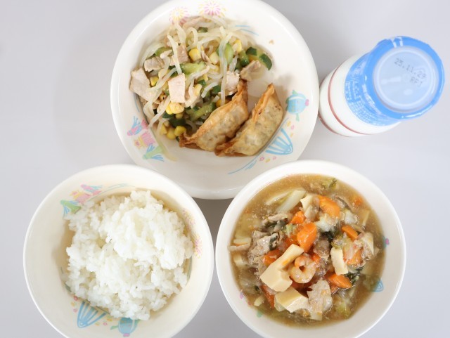 今日の給食は、ご飯、牛乳、八宝菜、揚げギョーザ、バンサンスーです。