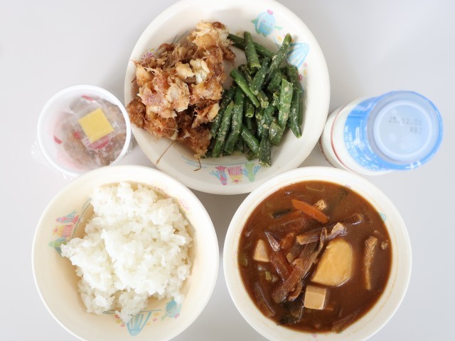 今日の給食は、ご飯、牛乳、たらのおかか揚げ、いんげんのごま和え、ぶた汁、納豆です。