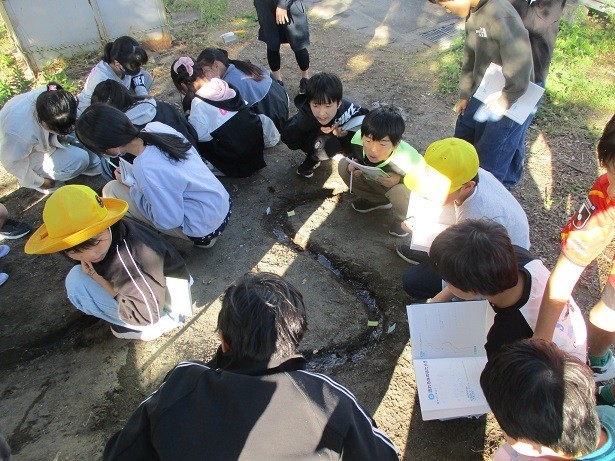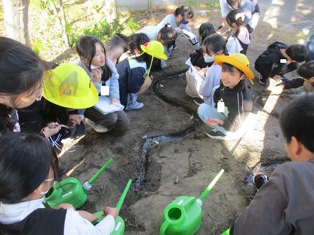 流れる水にはどんなはたらきがあるのか調べようというめあてで学習しました。地面が削られたり、土が積もったりする様子や場所による水の流れの速さの違いに着目して実験しました。
