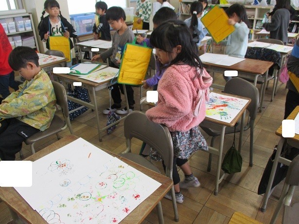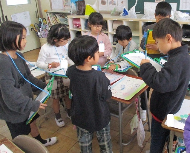 洗濯ばさみやトイレットペーパーの芯などでスタンプしたペタペタスタンプの鑑賞会をしました。友達の作品のよいところを見つけ、ワークシートに記入していきました。