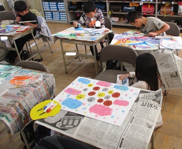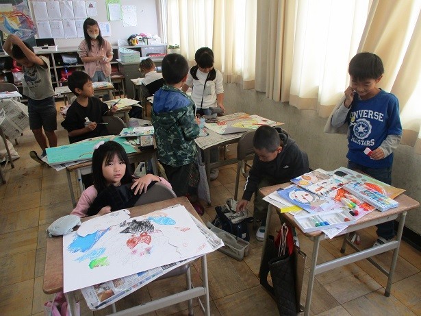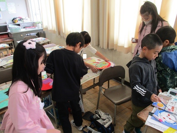 ふしぎなたまごの作品を仕上げようというめあてで活動しました。卵から出てくるものを丁寧に彩色し、生まれた理由が分かるようにしていました。