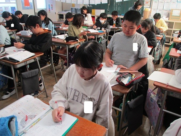 形が同じ図形の対応する辺の長さや角の大きさを調べようというめあてで学習しました。対応する辺の長さの比が等しいこと、対応するすべての角の大きさが等しいことを確認しました。