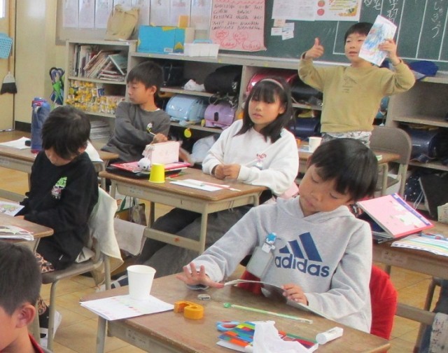 紙コップ花火をつくって気づいたことをまとめようというめあてで学習しました。まず、紙コップと割りばしを使って花火づくりに真剣に取り組みました。
