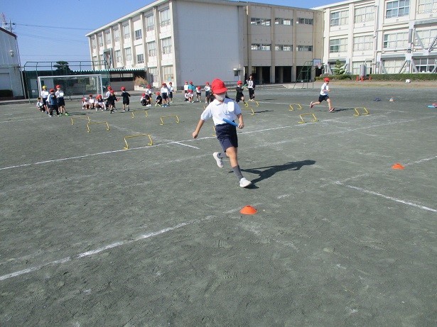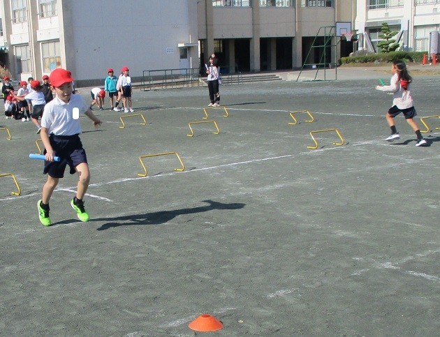 バトンがうまく渡せるように工夫してリレー遊びをしようというめあてで活動しました。ミニハードルを使ったリレーでは、ハードルに引っかかって転ぶ児童もいましたが、すぐに起き上がってがんばって走っていました。