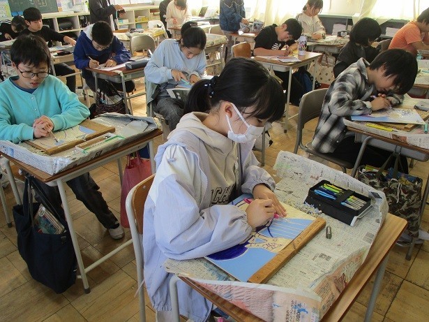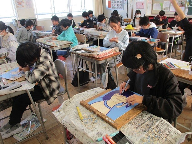 自画像の木版画が版木が彫りあがってきました。彫刻刀の特徴が生かされた作品に仕上がっていると思いました。完成が楽しみです。