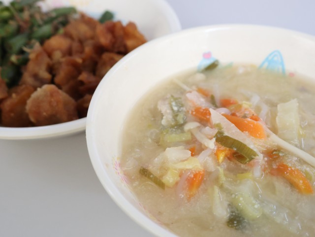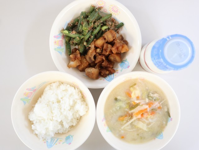 今日の給食は、ご飯、牛乳、とり肉のはちみつじょうゆがらめ、いんげんのおかか和え、一宮野菜の豆乳なべです。