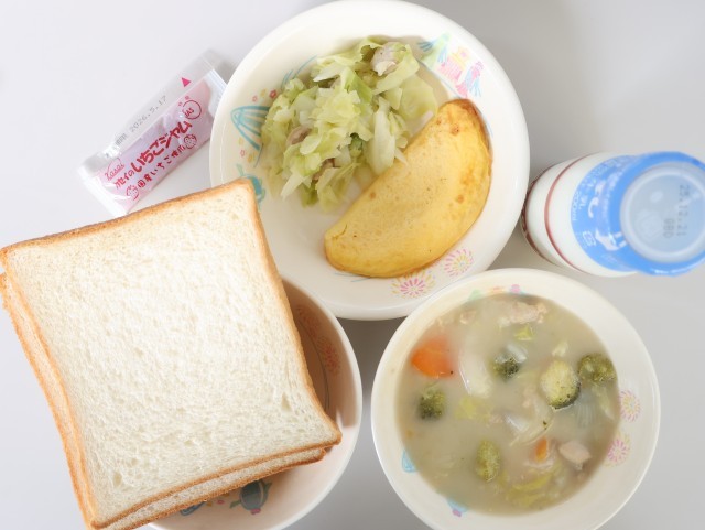 今日の給食は、スライスパン、牛乳、オムレツ、キャベツとウインナーのソテー、冬野菜のシチュー、いちごジャムです。