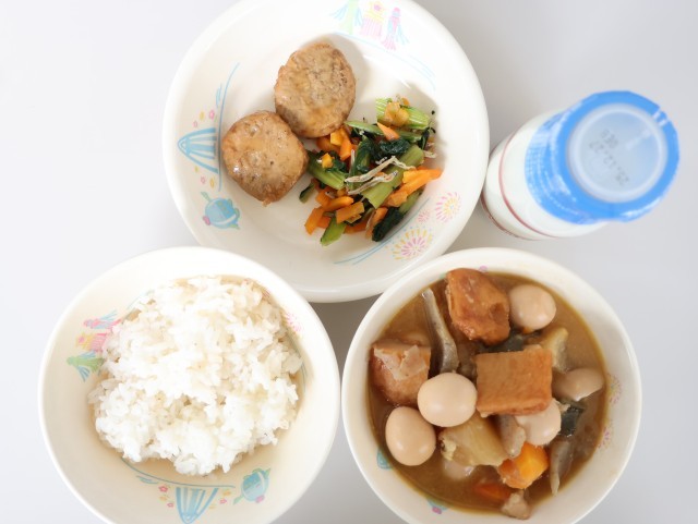 今日の給食は、麦ご飯、牛乳、関東煮、白ごまつくね、骨太和えです。