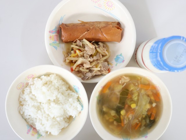 今日の給食は、ご飯、牛乳、チンジャオロース、春巻、はるさめスープです。