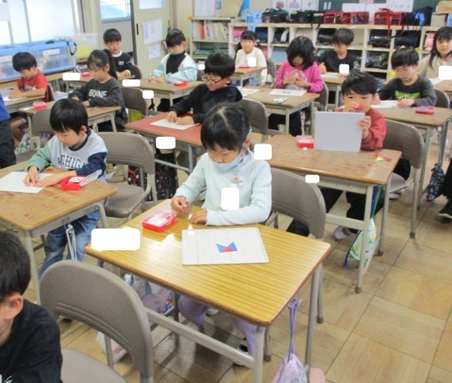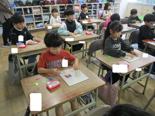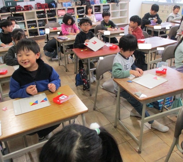 三角形を組み合わせて作った形から三角形を動かして見本の形になるように動かし方を考えました。示された形になるように真剣に考えることができました。