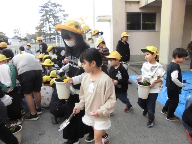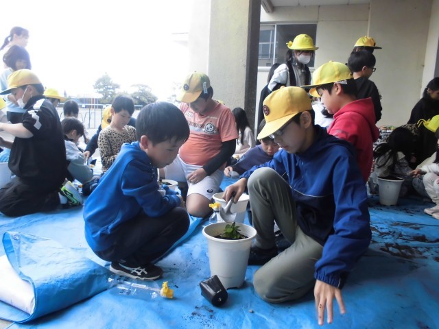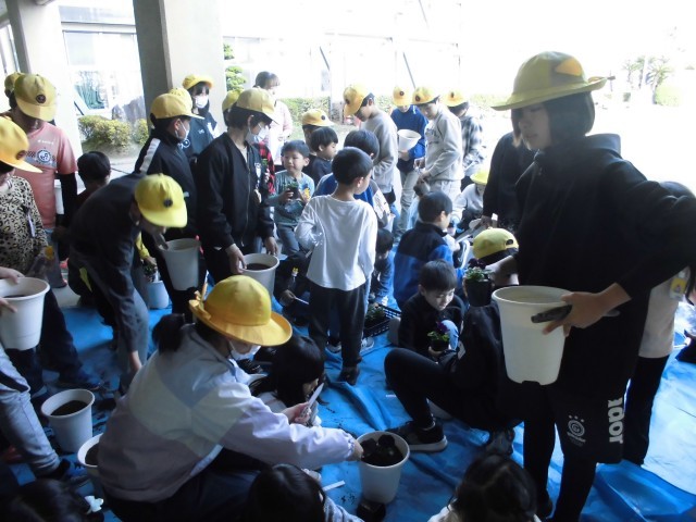 1年生と「ペア鉢運動」を行いました。ペア学年で一緒に植物を育てます。ここで育てた花は、卒業式や入学式の会場を飾る花になります。6年生は、1年生と一緒に植え、育てた花に卒業を祝ってもらいます。