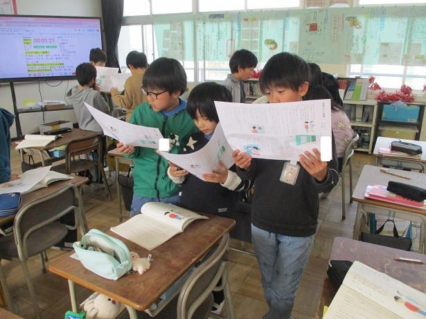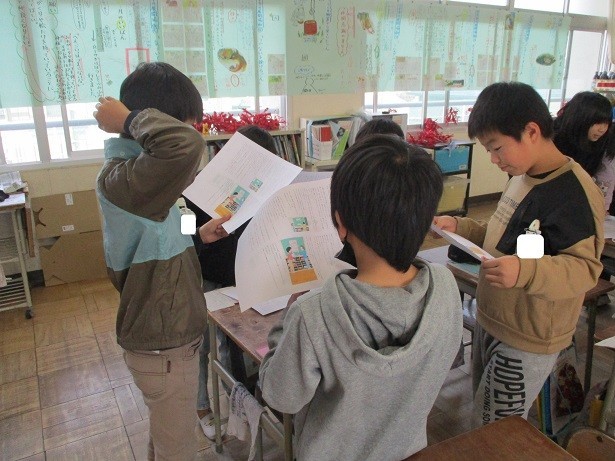友情のかべ新聞の集団読みを行いました。3から4人ずつに分かれて音読をして、文章の概要を把握していきました。