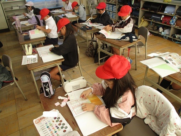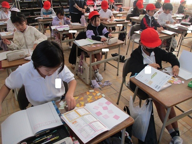 色紙を並べていろいろな模様をつくろうというめあてで学習しました。長方形と直角三角形を工夫して組み合わせ、真剣にきれいな模様をつくることができました。
