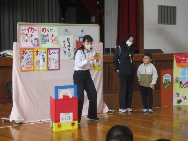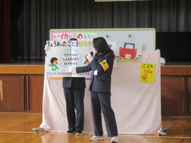 警察の方にお越しいただき、「いかのおすし」を学びました。外出時だけでなく、留守番をしているときにも自分の身を守るため、大切なことを確認することができました。1年生のみなさん、指導員さんから「防犯教室で学んだことをおうちの人に話してね」という宿題が出ていましたね!「いかのおすし」をぜんぶ思い出して、おうちの人に伝えられるかな~??