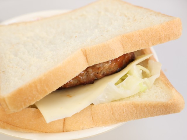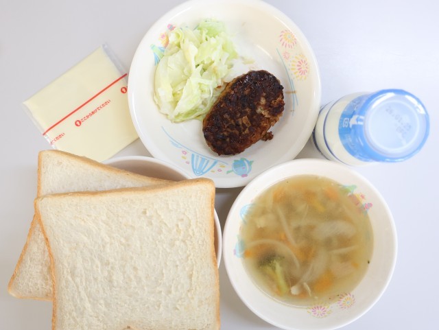 今日の給食は、スライスパン、牛乳、チーズハンバーグサンドの具、ハンバーグのケチャップソースがけ、キャベツのドレッシング和え、スライスチーズ、コンソメスープです。