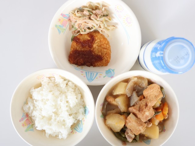 今日の給食は、ご飯、牛乳、だいこんと厚揚げの煮物、ソースカツ、もやしのツナ和えです。