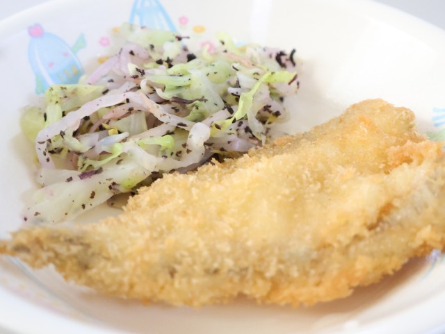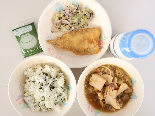 今日の給食は、わかめご飯、牛乳、ひきずり、にぎすフライ、赤じそ和え、ういろうです。