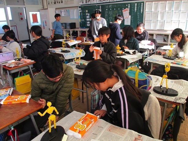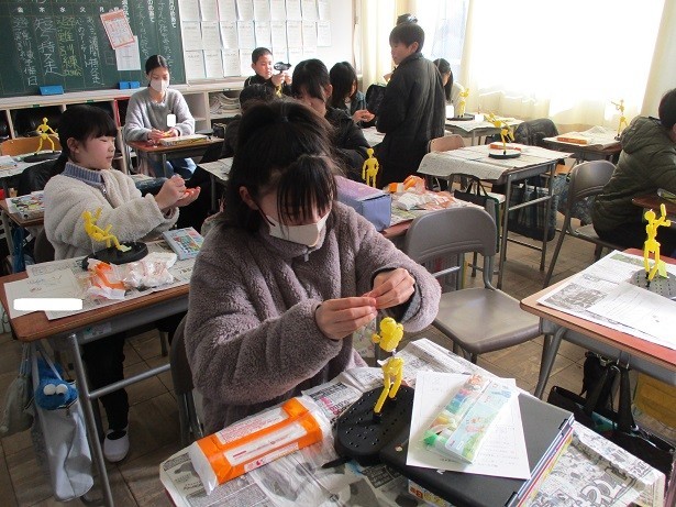 未来のわたしというテーマで針金の芯に色付けをした紙粘土を貼り付け、将来の自分の姿を表現しています。躍動感のある作品に仕上がっていっています。