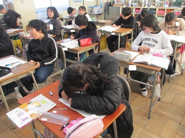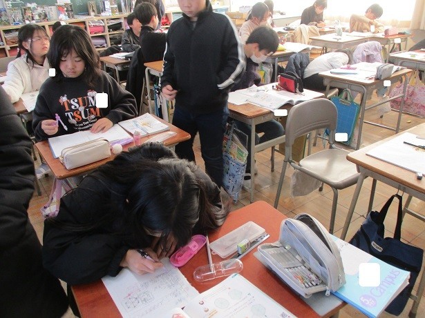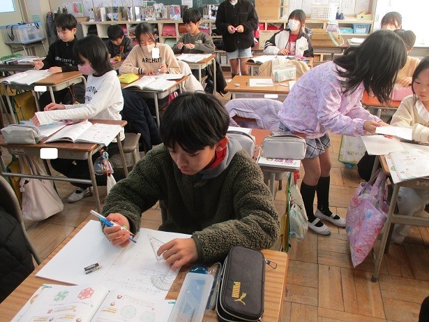 円を使って正六角形をかく方法を考えようというめあてで学習しました。コンパスと分度器を使って任意の大きさの正六角形を各自でノートにかきました。