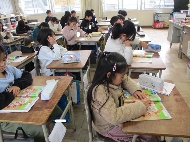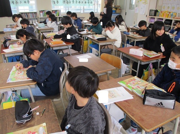 地図を見ながらどの場所かを考えようというめあてで学習しました。英語の音声の説明を聞き取って教科書の図のどの場所かを答えました。
