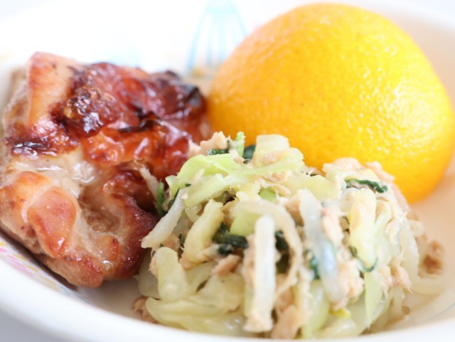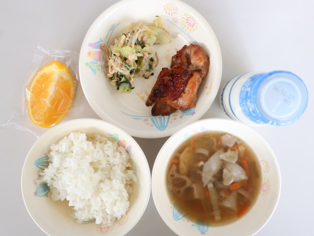 今日の給食は、ご飯、牛乳、てりどり、しゅんぎくのツナ和え、冬の根菜汁、しらぬいです。