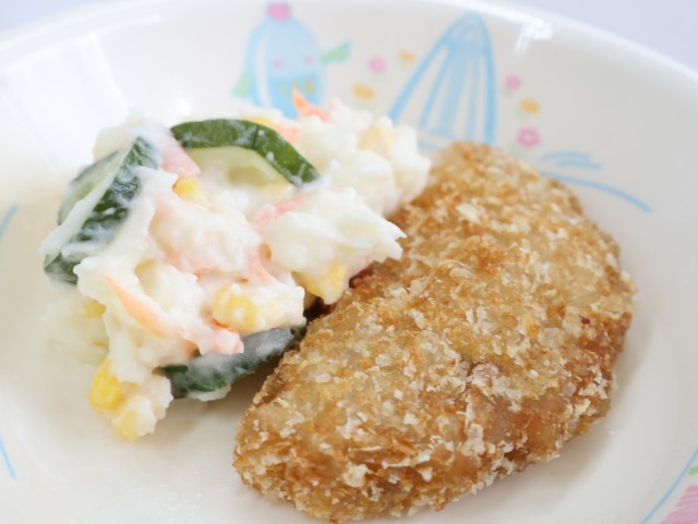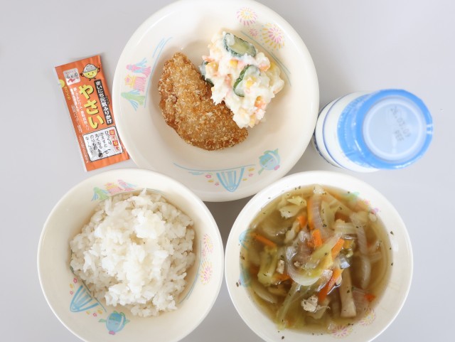 今日の給食は、麦ご飯、牛乳、ボロニアカツ、ポテトサラダ、コンソメスープ、野菜ふりかけです。