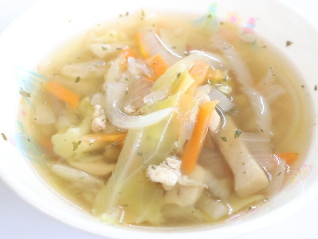 給食には毎日、たくさんの食材が使われています。これは、みなさんの健やかな成長を願って、いろいろな食材から栄養をとってほしいからです。今日のコンソメスープも具だくさんに仕上がっています。しっかり食べて元気に過ごしましょう。